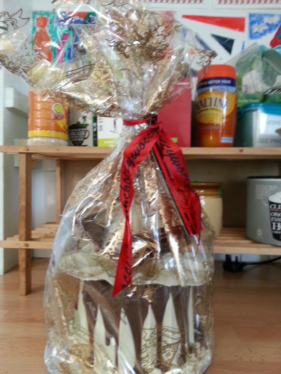 To borrow the apparently incorrect &/or misquoted hackneyed phrase of the late Marie Antoinette… the latest ‘foodshare’ (for those nearer &/or on the bread line) that I’ve encountered was this past Tuesday: following the usual very good, hot vegan lunch at Brighton Unemployed Centre and Families Project (I volunteer on/for their food-growing allotments), a dark chocolate cake – lavishly decorated with thick slabs of chocolate – was cut into many small pieces and shared by the usual mixed bunch lunch crowd. Said cake was the offering to the Centre by the uber chocolatiers of East Sussex fame, namely Choccywoccydoodah. Not able to afford their delicacies normally – but well used to snapping images of same through their shop windows – this was a shared treat to savour with my mug of Ovaltine: ‘Yum’ in a word!